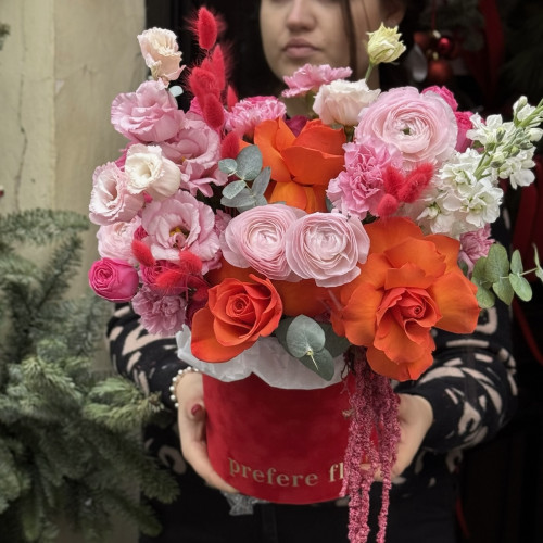 Květy jsou umístěné v kloboukové krabici, která ladí s celou vazbou a dodává jí punc elegantnosti. Vazbu není nutné z krabice odstraňovat a shánět jí vhodnou vázu. V krabici je vlhká aranžovací hmota, která květinám poskytuje potřebnou vláhu a péči.
