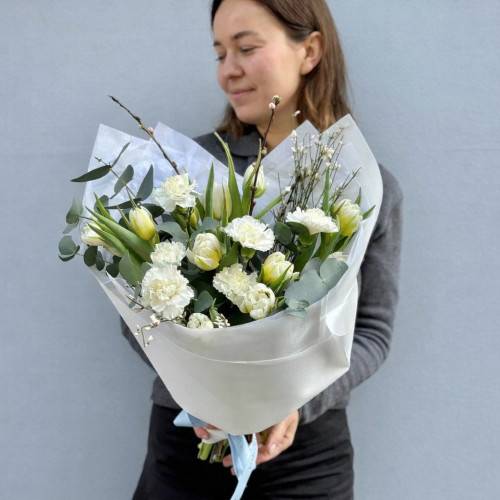 A spring bouquet of fragrant tulips and delicate dianthus — a celebration of nature coming back to life. The blend of fresh pastel hues with brighter accents forms a balanced arrangement that brightens any room and lifts the recipient’s spirits. Perfect for spring holidays, as a thoughtful gift, or simply to bring a touch of seasonal joy.
