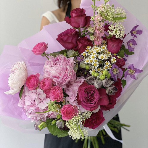 Beautiful peony and classic roses, gorgeous callas and lash decorative green create a harmonious composition that will not leave anyone indifferent. Make someone special feel happy with this original bouquet!