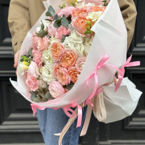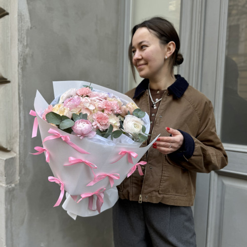 Spring mood is available all year round! We make this bouquet with the freshest roses, tulips and add a mix of seasonal flowers. Each bouquet is unique, and we cannot say in advance which flowers will be included in the composition of your particular bouquet. But we always guarantee high quality and the freshness of flowers.