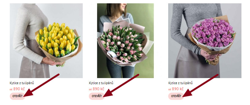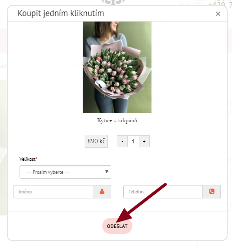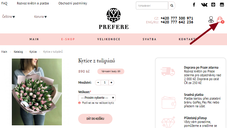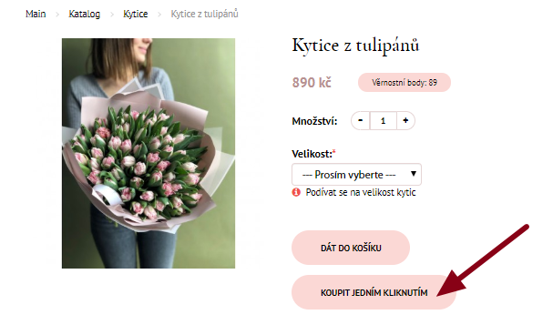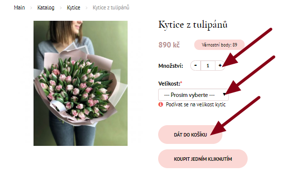 Informace o zboží se otevře na nové stránce. Zvolte počet kusů a velikost kytice. Přidejte zboží do košíku kliknutím na tlačítko "Dát do košíku".