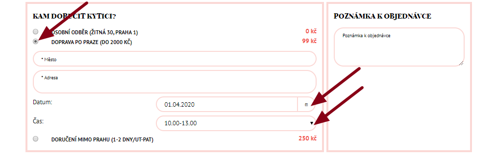 Vyplňte způsob a vhodný čas pro doručení objednávky, uveďte adresu. Také můžete zanechat poznámku k objednávce.
