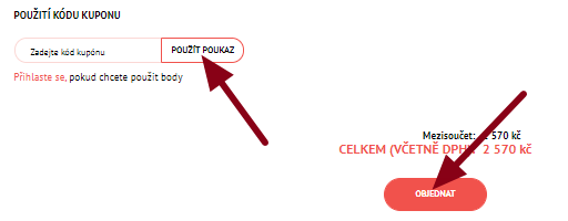 Pokud máte slevový poukaz, zadejte kód do okna pod objednávkovým formulářem a klikněte na „Použít poukaz“. Po přihlášení do systému můžete použít nasbírané bonusové body.