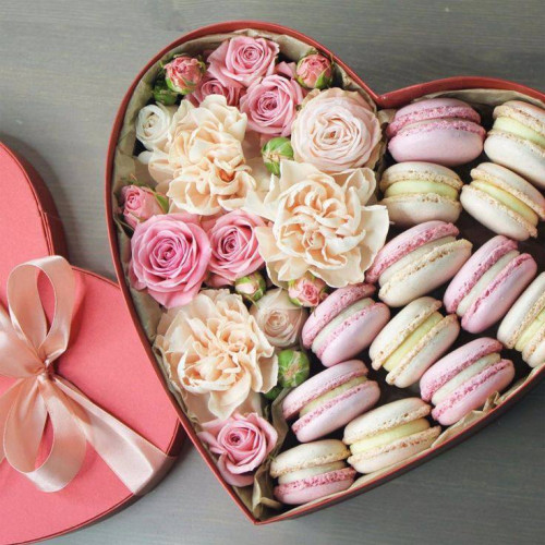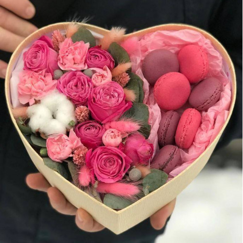 Květiny mix "Srdce" v krabici a makronky | ![]() |