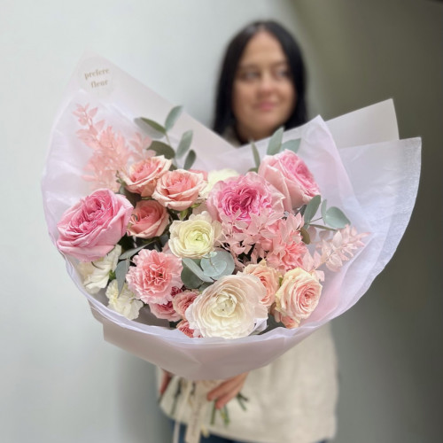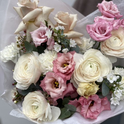Neměnný základ vazby (k dispozici po celý rok): klasické a pivoňkové růže v jemných pastelových barvách probudí lásku v každé ženě. Výraznější eustomy nadchnout snílky a podpoří fantazii. Stračky a fialy už jen dodají celé kytici punc jedinečnosti a něžného vzhledu.