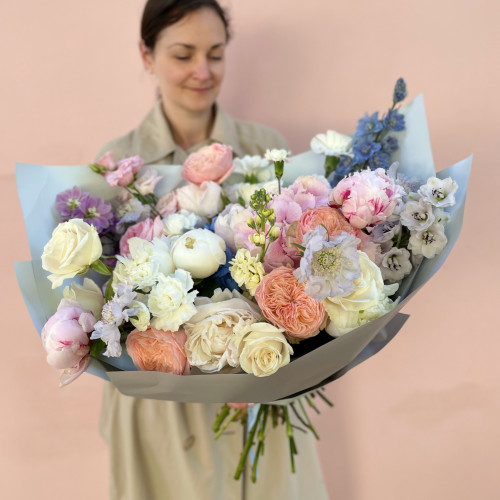 Neměnný základ vazby (k dispozici po celý rok): klasické a pivoňkové růže dodají svými plnými květy na objemu. Výraznější eustomy nadchnou snílky a podpoří fantazii. Stračky a fialy už jen dodají celé kytici punc jedinečnosti.