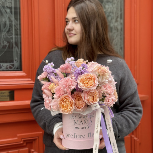 Kytice s nádechem meruňkové barvy v kloboukové krabici