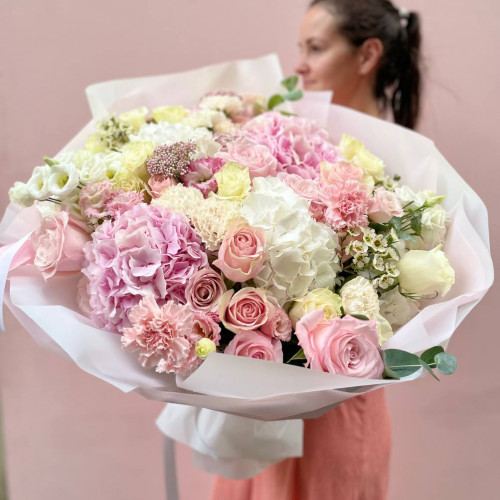 Neměnný základ vazby (k dispozici po celý rok): klasické a pivoňkové růže v jemných pastelových barvách probudí lásku v každé ženě. Eustomy nadchnou snílky a podpoří fantazii. Stračky a fialy už jen dodají celé kytici punc jedinečnosti a něžného vzhledu.