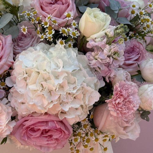Neměnný základ vazby (k dispozici po celý rok): klasické a pivoňkové růže v jemných pastelových barvách probudí lásku v každé ženě.