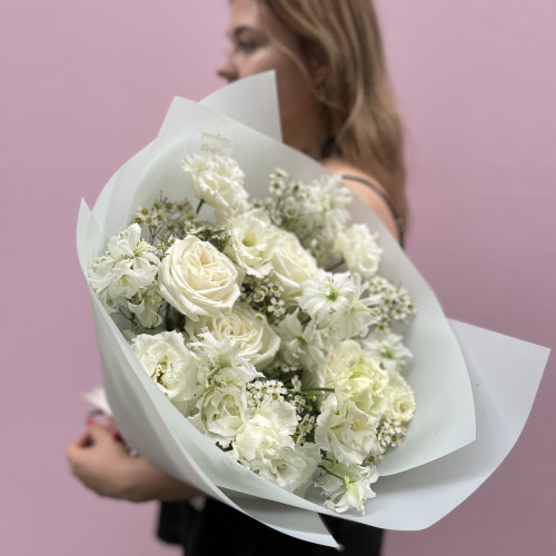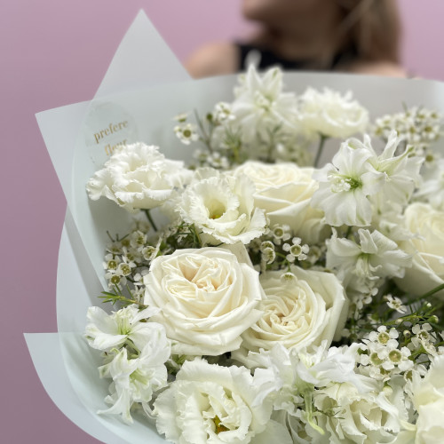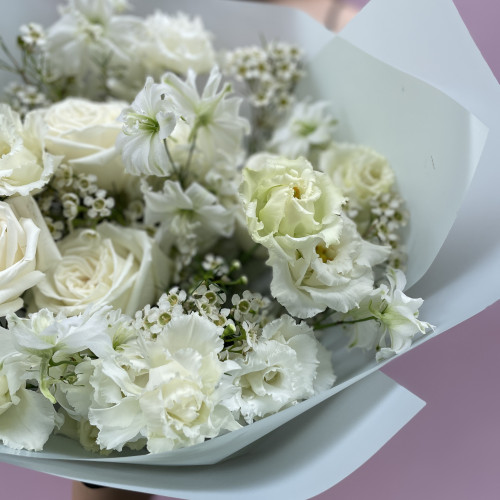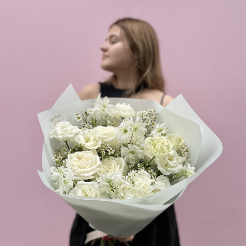 Neměnný základ vazby (k dispozici po celý rok): klasické a pivoňkové růže v bílých a narůžovělých odstínech probudí lásku v každé ženě. Eustomy nadchnou snílky a podpoří fantazii. Stračky a fialy už jen dodají celé kytici punc jedinečnosti a něžného vzhledu.