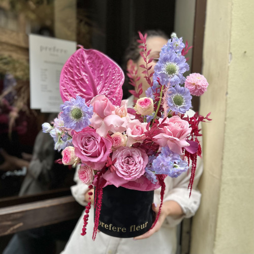 Мы собрали сезонные цветы в яркую композицию, поместив их в велюровую шляпную коробку с золотистым тиснением. Выберите размер букета, оформите заказ в пару кликов и ждите благодарных реакций от адресата.
