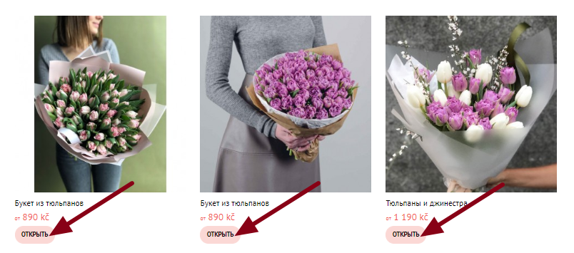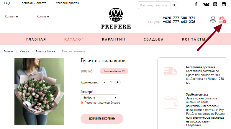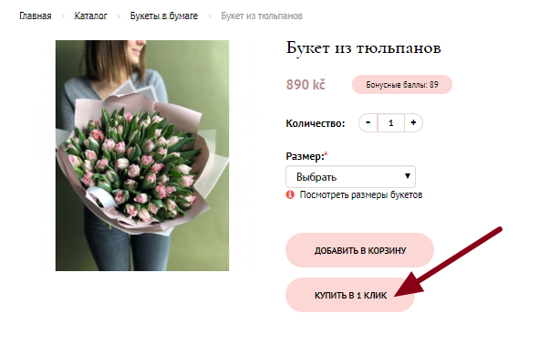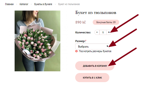Откроется карточка продукта. Выберите количество товаров и размер букета. Добавьте понравившийся товар в корзину, нажав кнопку «Добавить в корзину».