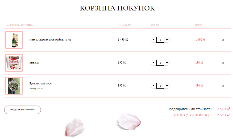 В корзине находится итоговый список всех товаров в формате таблицы: изображение товара и его наименование, цена, количество и итоговая стоимость. Удалить товар из корзины можно, нажав на крестик.