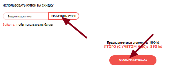 Если у вас есть купон на скидку, введите код в окно под формой заказа и нажмите «Применить купон». После входа в систему вы также можете использовать накопленные бонусные баллы.
