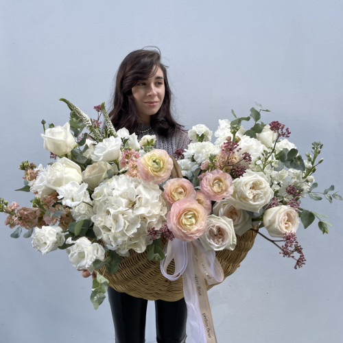 Флористы из Prefere Fleur отобрали для этой композиции свежайшие сезонные цветы из Голландии, собрав все пастельно-розовые оттенки в одной корзине. Эустомы и розы, гвоздики и пионовидные розы, украшенные декоративной зеленью, порадуют своей нежной красотой каждую.