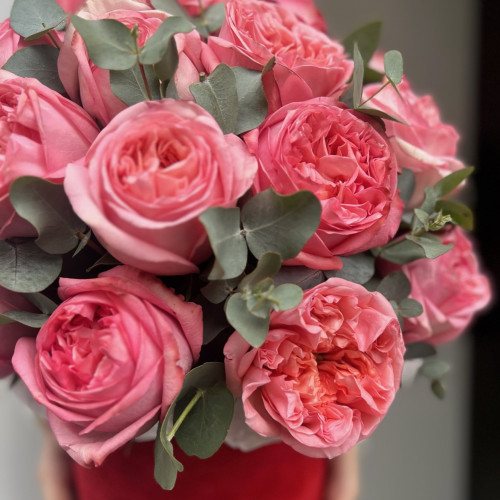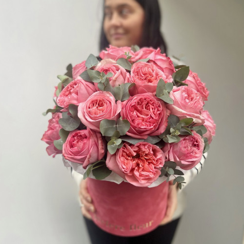 Víte, jak vznikly pivoňkové růže? Vyšlechtil je pan David Austin, známý šlechtitel, který se při své práci inspiroval starými odrůdami růží. Díky tomu se mu podařilo vytvořit nádherné plné květy podobné oblíbeným pivoňkám. Vzdejte holt pivoňkovým růžím v kontrastu s eucalyptem. Krása a elegance se dokonale snoubí v praktické kloboukové krabici.